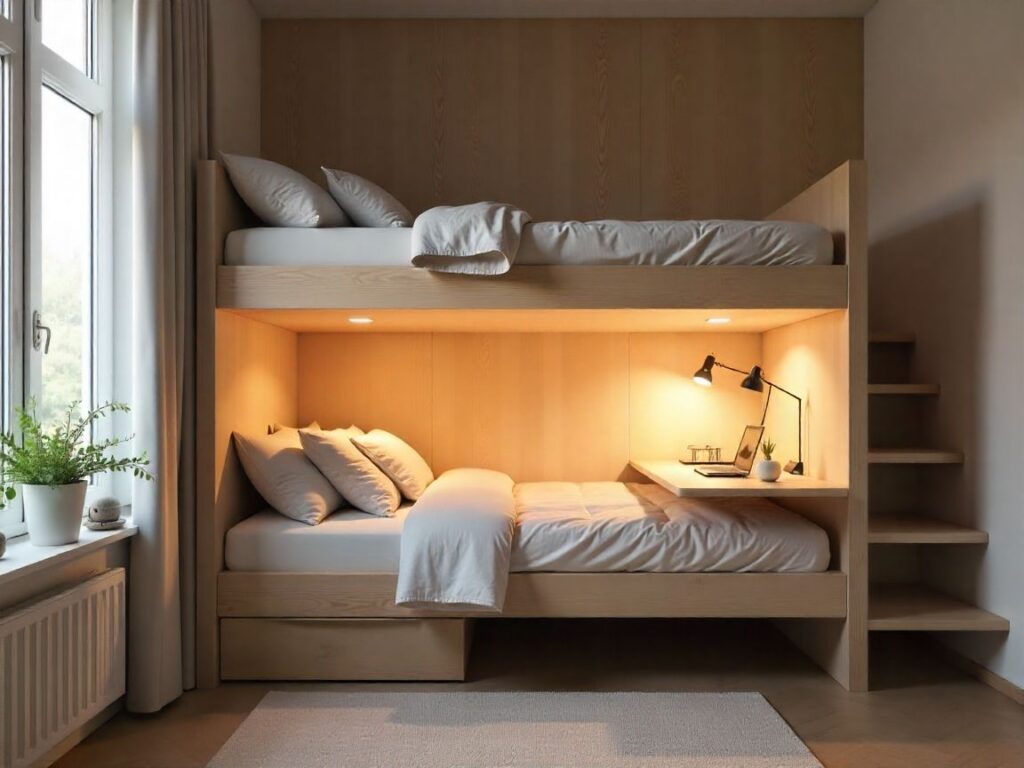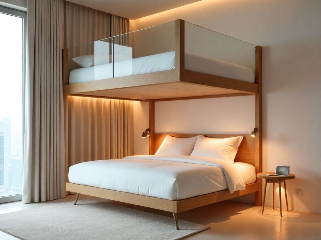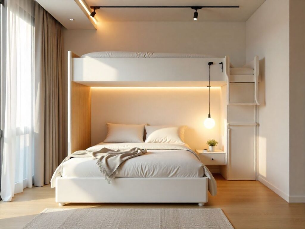Opt for matte white or warm oak veneer on slim steel posts for a light look. Make sure there’s 34–36 inches of headroom for adults. Add hidden LED strips to free up space for a nightstand.
