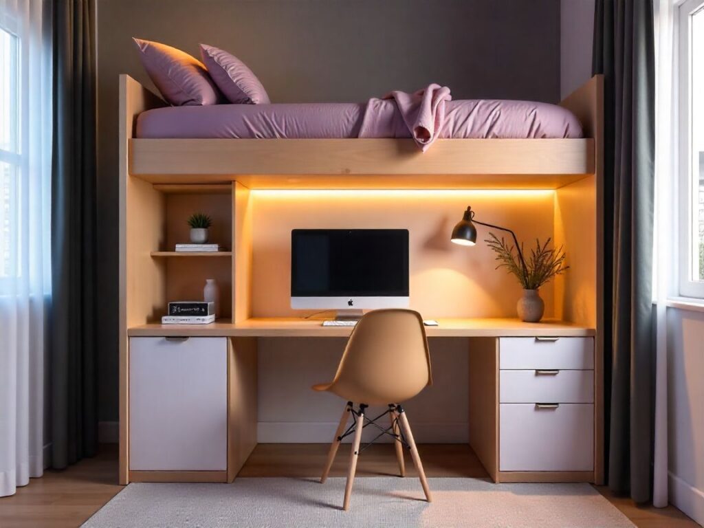 For Dubai apartments, loft beds offer under-bed storage and cable management. Add LED lights under the bed for bright work areas. These ideas make small spaces calm and efficient.